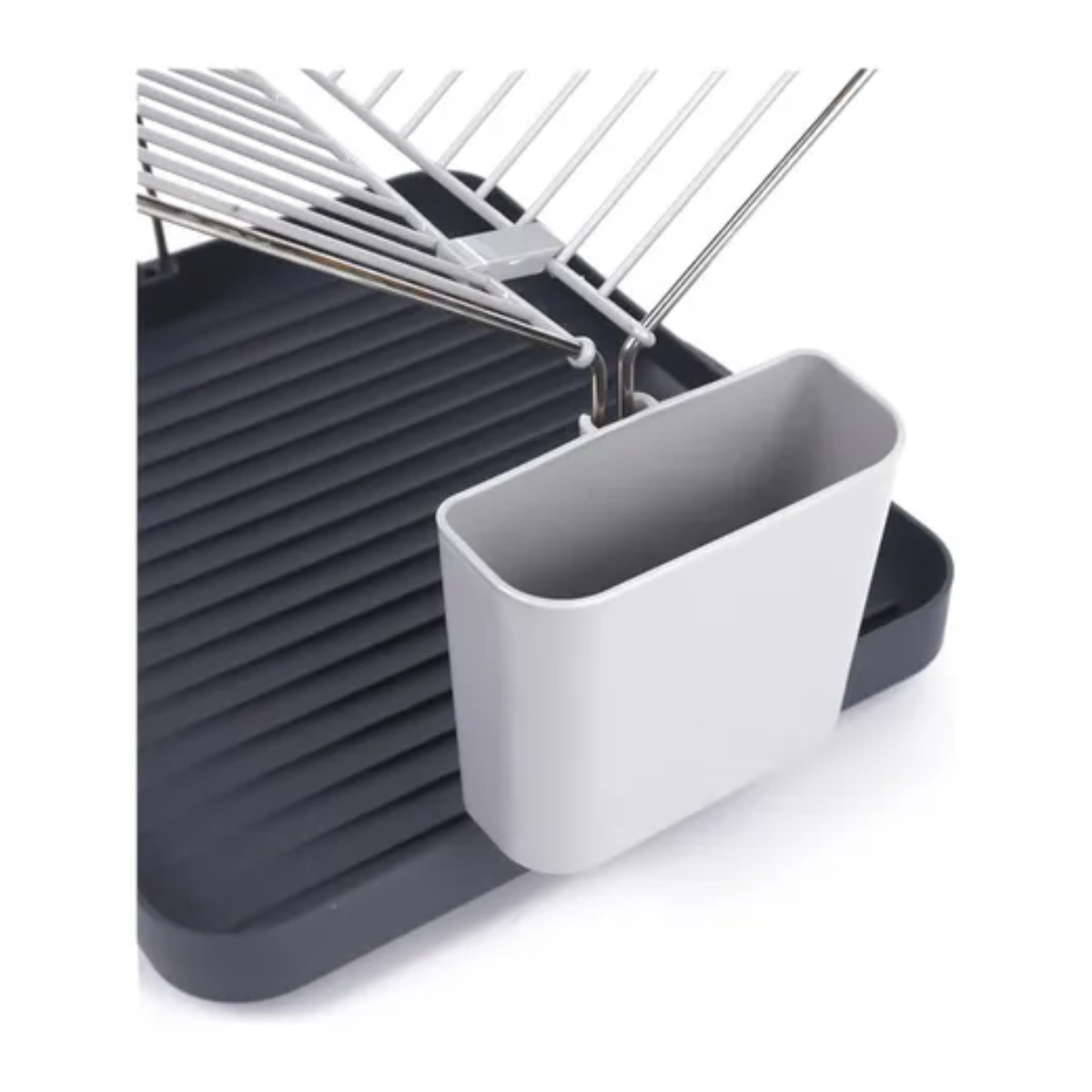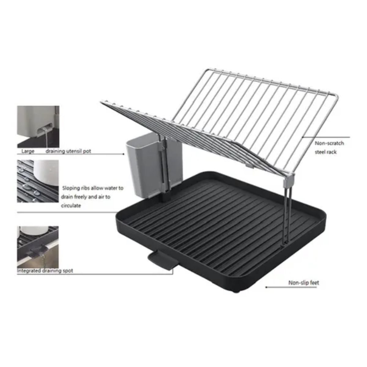 Con una estructura de doble nivel, la parte superior sostiene platos y bandejas, mientras que la inferior es ideal para tazas, bowls y cubiertos. Incluye un compartimento lateral para cubiertos y una bandeja de goteo extraíble que evita la acumulación de agua en la encimera, manteniendo tu cocina siempre limpia y seca.